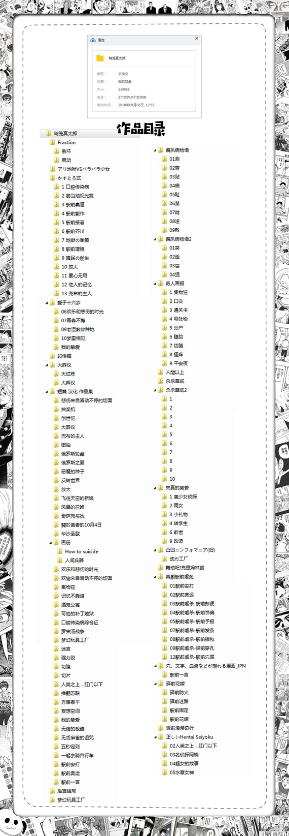 资源信息:驾笼真太郎漫画作品合集(全多部),总大小1.69GB,按实验性等级分5包压缩;